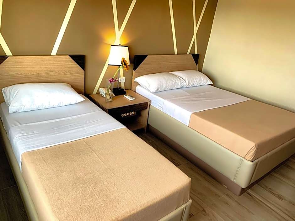 This room has one single bed and one double bed in room. Some rooms on higher floors with city views. Marble floors, linens, airconditioning and some bath amenities included. Flat screen cable Tv , desk and full length mirror also in room.